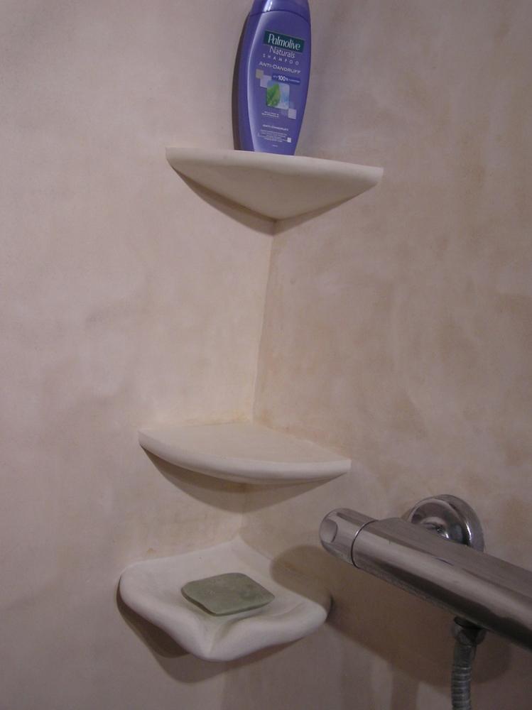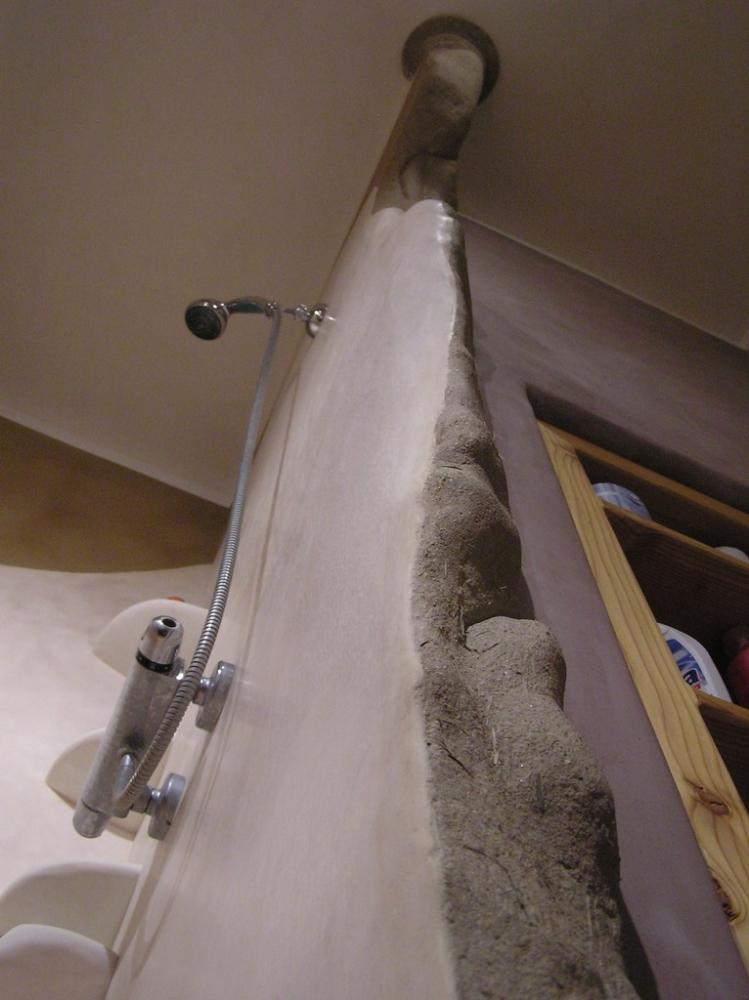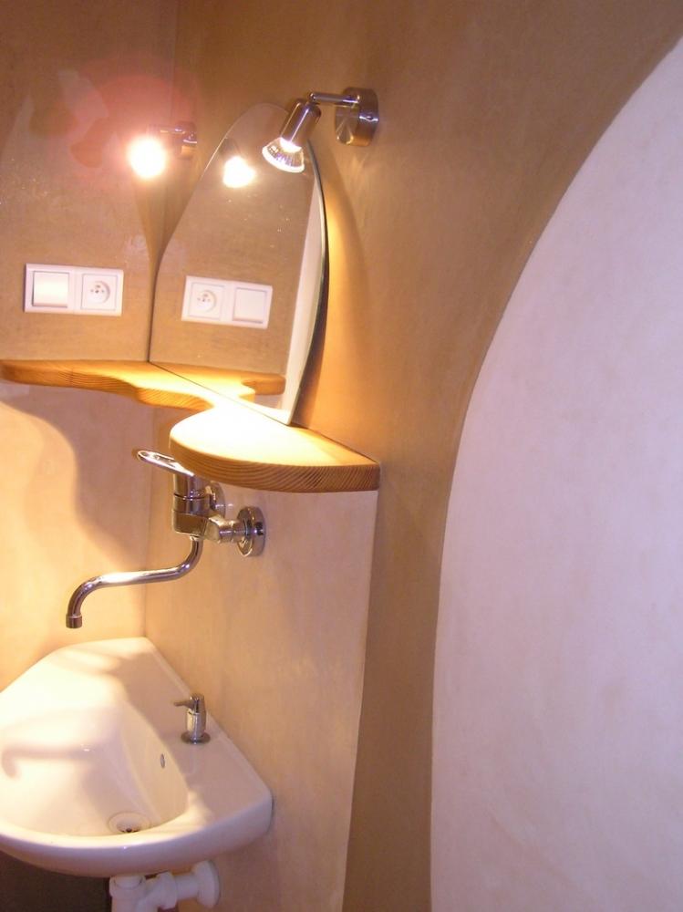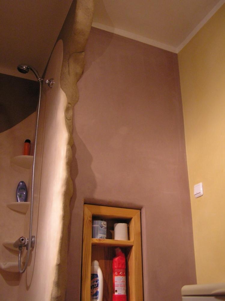 Jedná se o rekonstrukci 45let staré koupelny v cihovém bytovém domě. Původní omítka byla osekaná až na cihly, na kterých je 1,5-2,5cm hrubá hliněná omítka (jíl+ostrý písek). Vrchní vrstvy: stěna u umyvadla - čistý hnědý jíl zatažený štětcem, min. vrstva kvůli praskání *stěna kolem dveří - také čistý hnědý jíl vyhlazený plastovým hladítkem také min. vrstva *ostatní barevné stěny - barevný jíl + písek z Rudic zahlazené plastovým hladítkem, přesto dost náchylné na otěr, vrstva cca 2mm štuk *kolem umyvadla - padelakt namýchaný dle vlastního receptu (proto ten název), pracovní postup stejný jako u tadelaktu od Kreidezeitu - hlazeno kamenem, aplikováno na hrubé hliněnné omítce *sprchový kout - stejné jako u umyvadla, pouze pro nedostatek času (také v rámci experimentu) hlazeno pouze plastovým hladítkem, jako u jílových omítek. Zde je pod štukem na hrubé hliněnné omítce natažena perlinka s flexi lepidlem. Toto lepidlo jsem použil záměrně, abych měl nějakou jistotu v jakési hydroizolaci, kdyby snad padelakt propouštěl. Poličky ve sprše je vysochaný ytong, pouze mýdlenka je hodně složitá, tak se nepovedla ani na podruhé nanést v požadované kvalitě, tak jsem druhou vrstvu obrousil, že jina nanesu znovu, ale zůstalo u obroušeného - designově zajimavé, zbytek prověří čas...