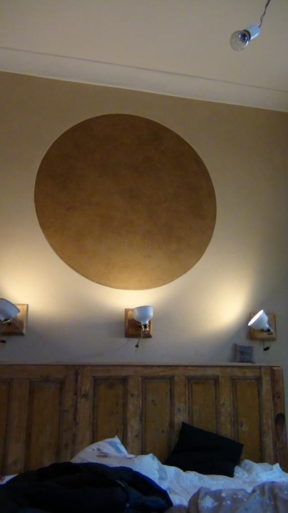 Materiály Picas.Hrubá omítka s řezankou. Jemná omítka art s kostřavou. Centrální kruh, pro zvýraznění kresby kamínků a slámy, napuštěný olejovoskem.