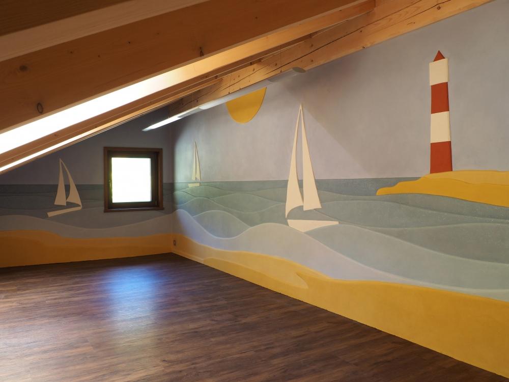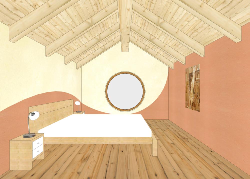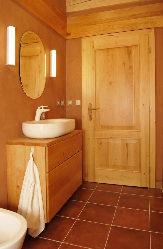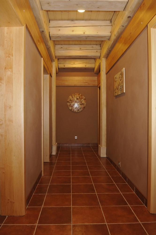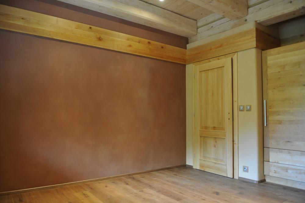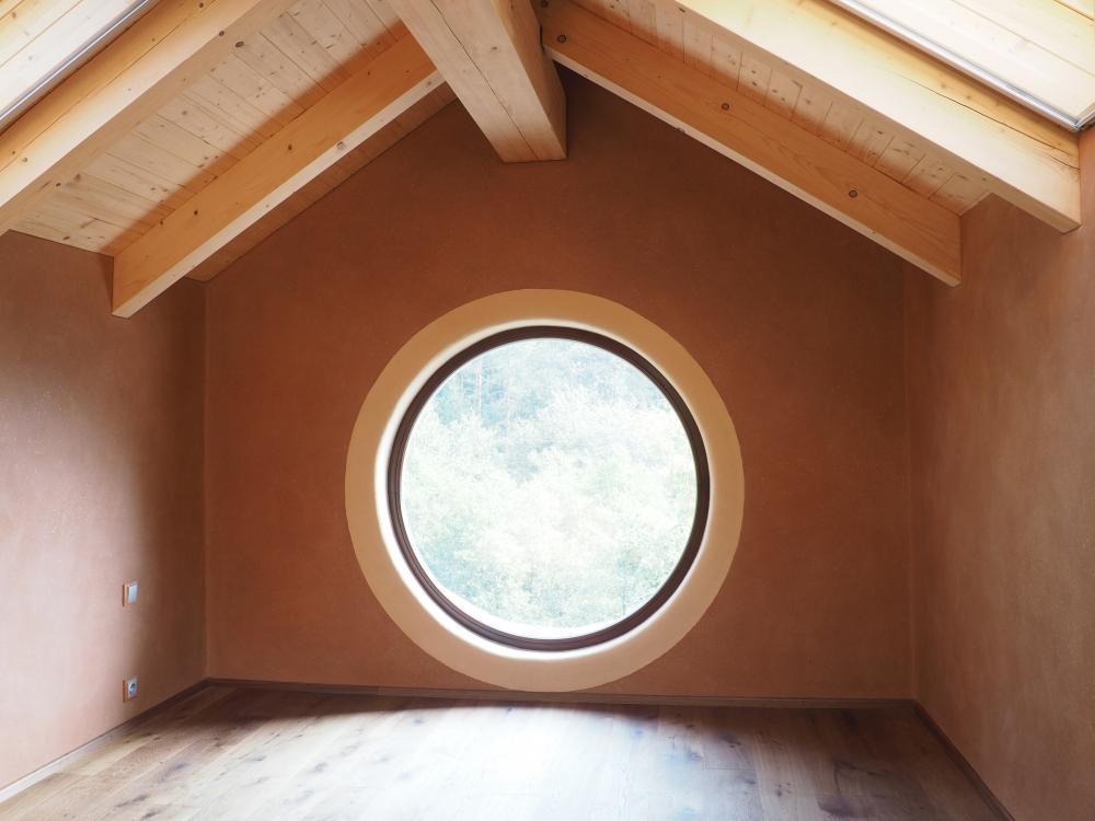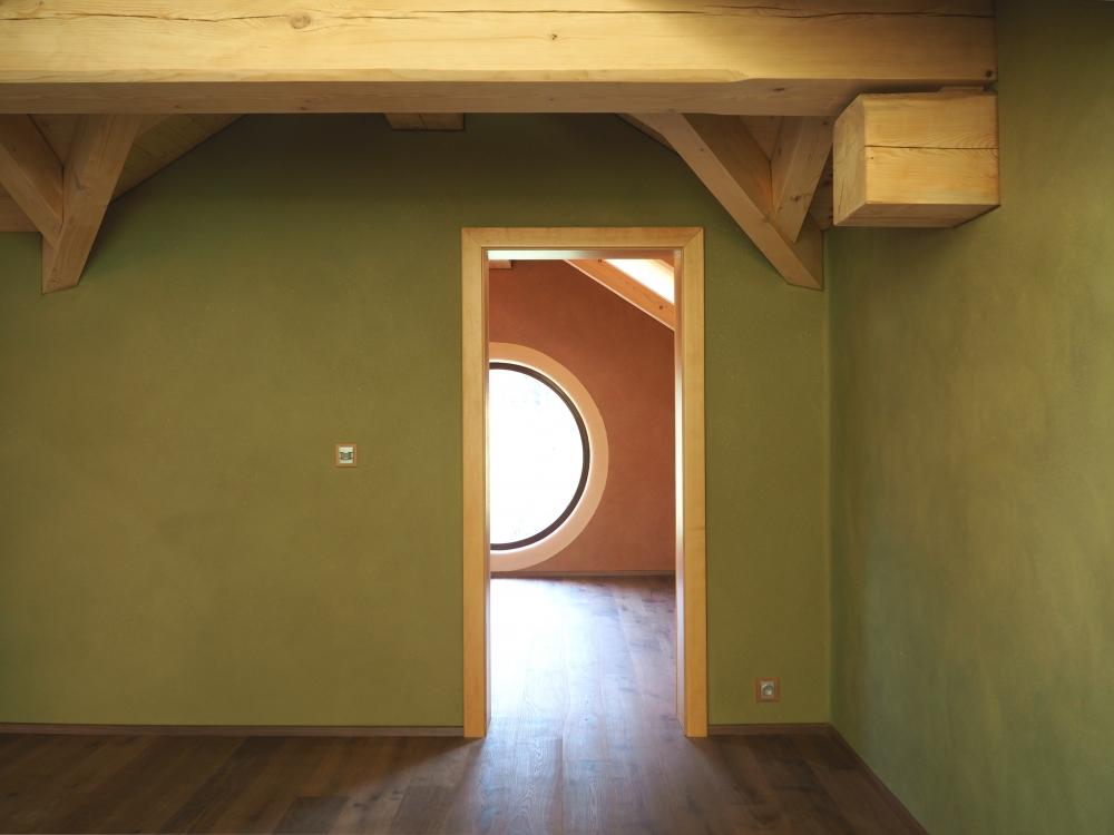 Do roubeného domu na Tišnovsku jsem byla pozvána ve fázi probíhající hrubé stavby, investor potřeboval dílčí pomoc s interiérem, zejména poradit s typem a barevností hliněných omítek. Byly preferovány syté barvy a kontrasty, takže některé omítky byly obohaceny intenzivními pigmenty. Omítky prováděl Aleš Dorazil s kolegy. V domě byl dále realizován velkoplošný reliéf, viz zde. Realizace 2016/2017.