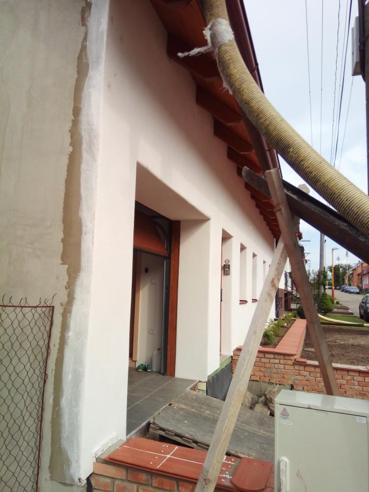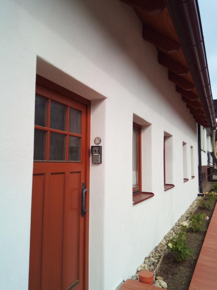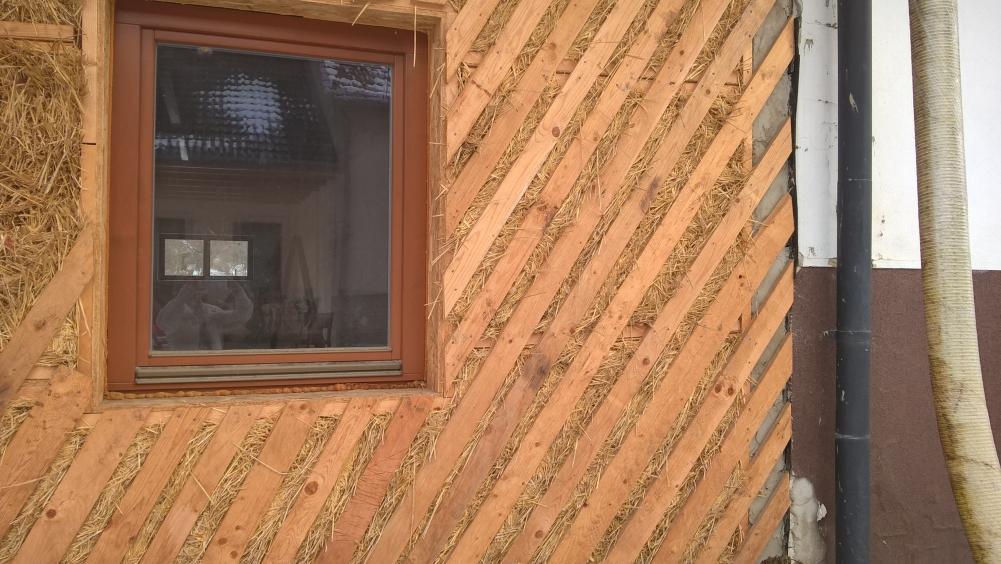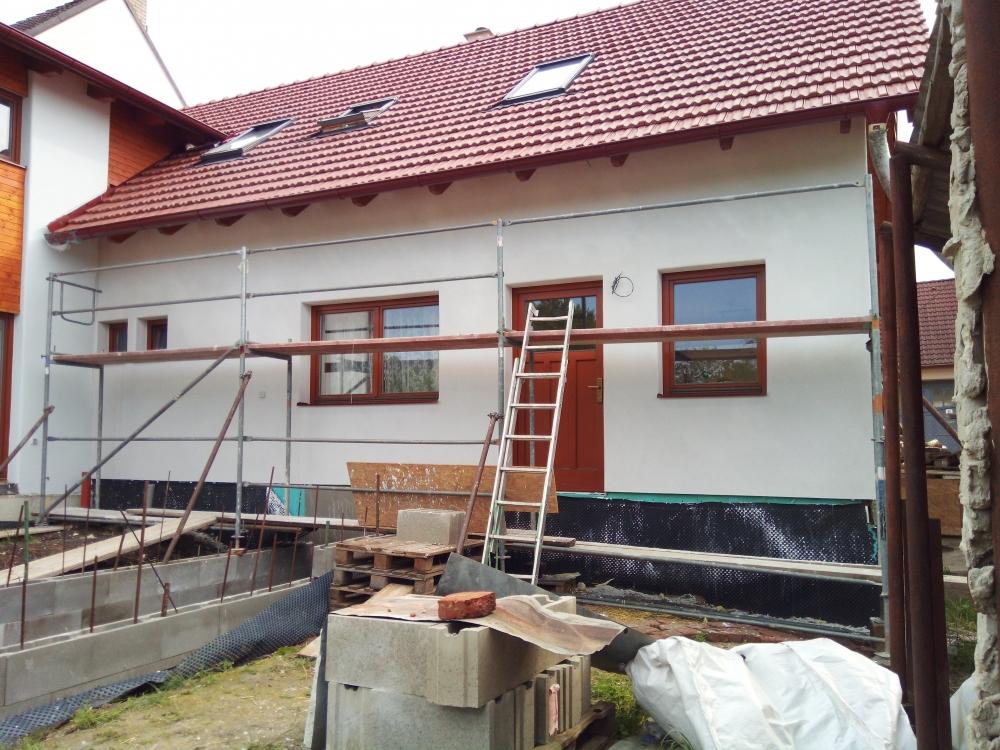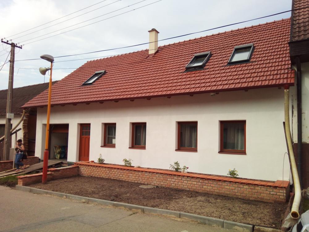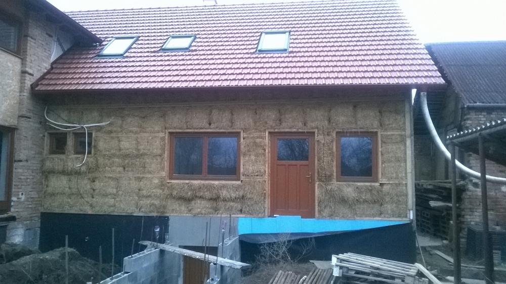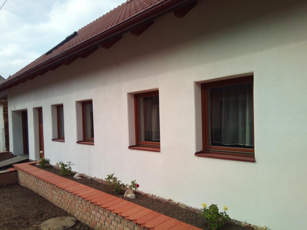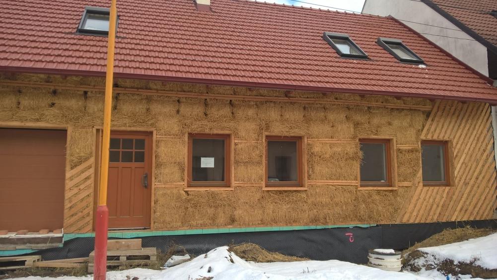 Nově postavený slaměný dům ve staré řadové zástavbě. Jako podklad bylo použito dřevěné diagonální laťování, na které se připevnil štukatérský rákos. Do první vrstvy hrubé omítky se zapracovala perlinka a druhá vrstva se zatočila hladítkem s houbou. Zakulacení špalet a provedení řízené spáry u dřevěných prvků je samozřejmostí...