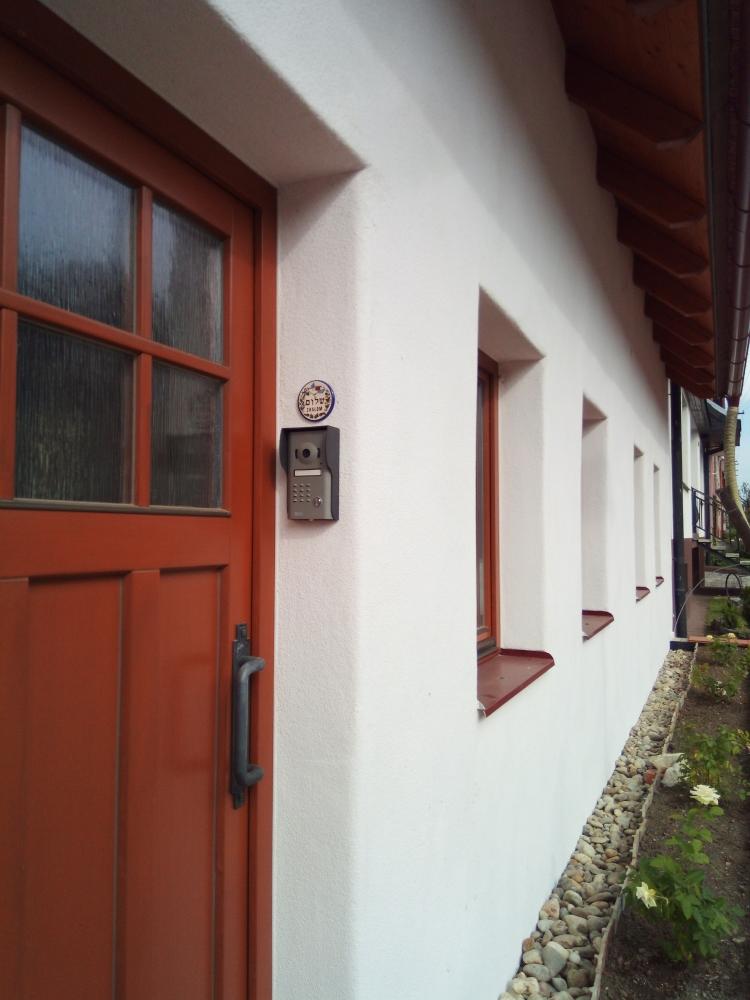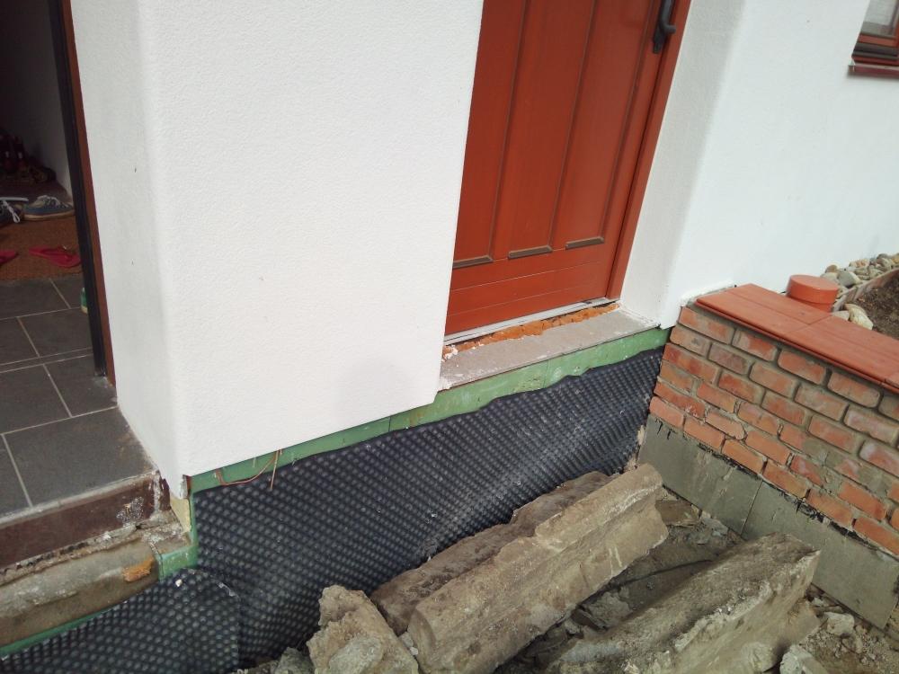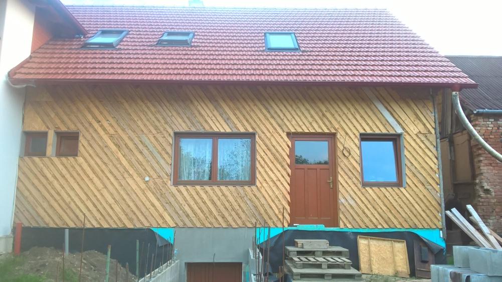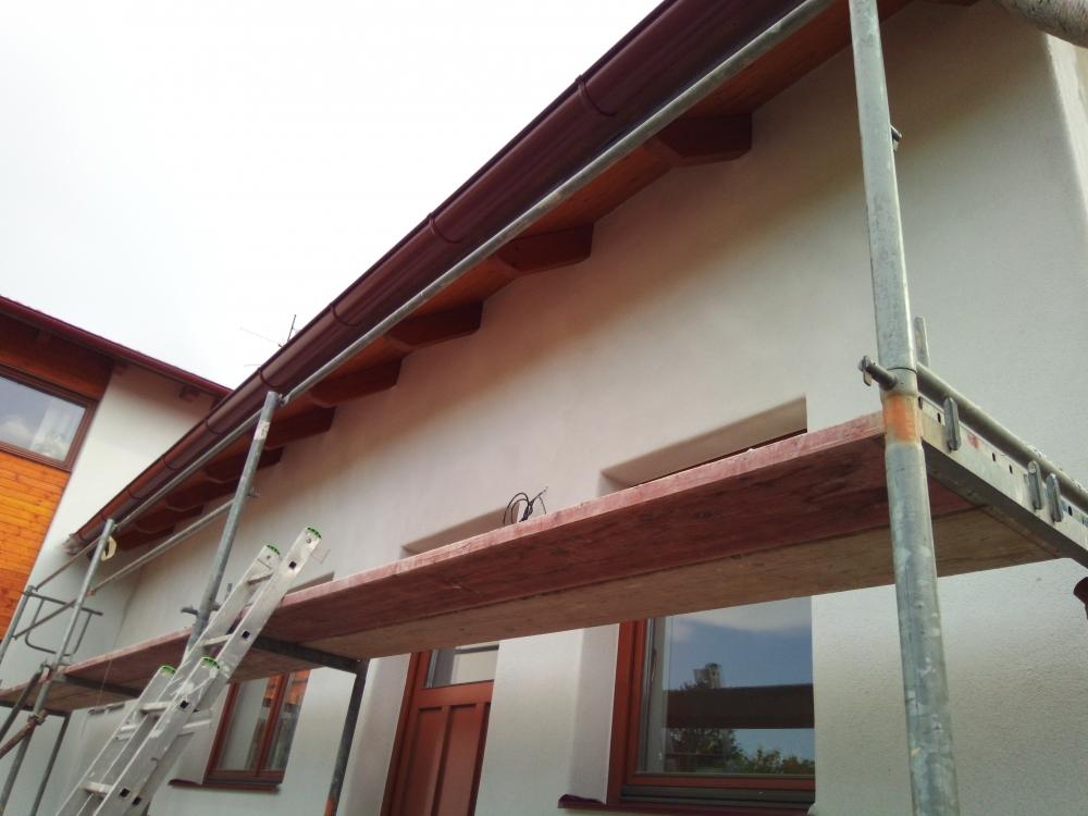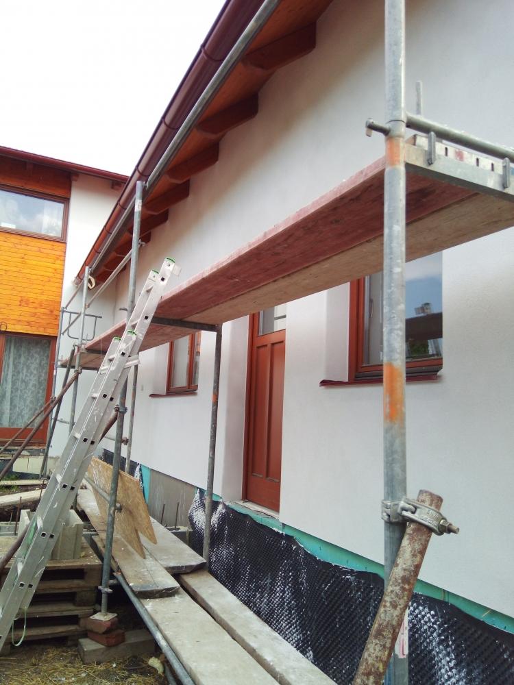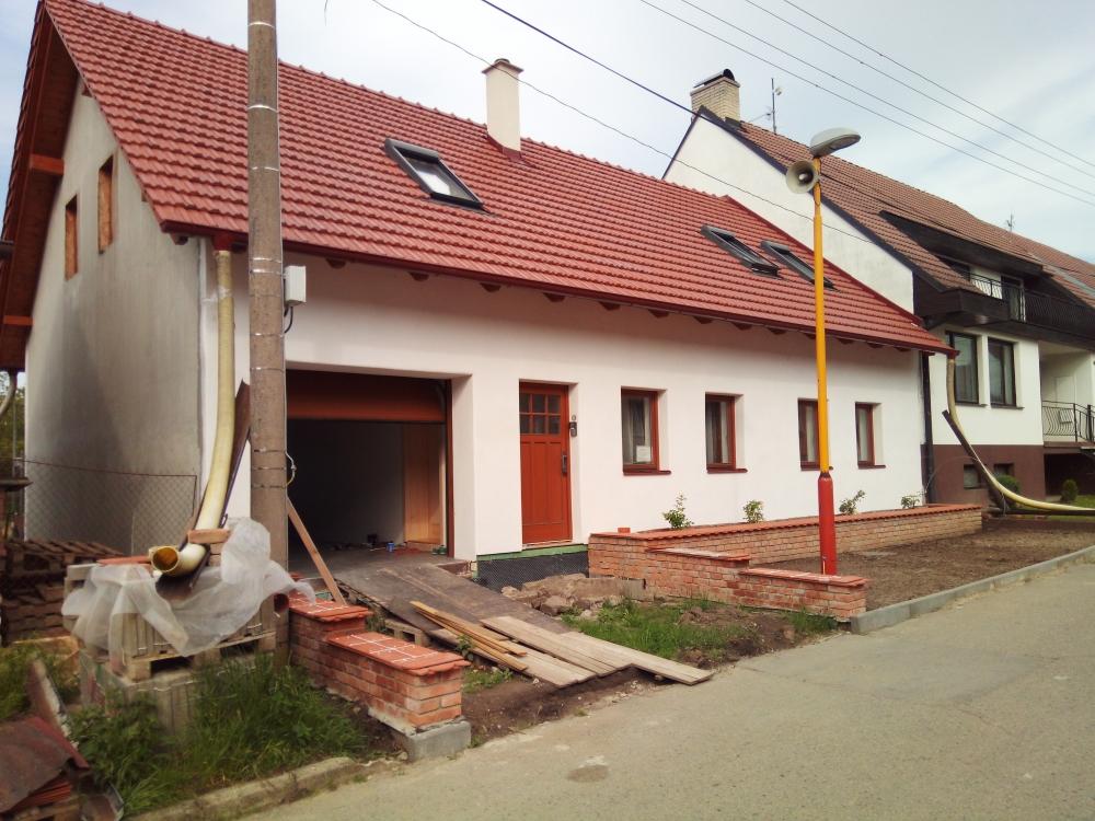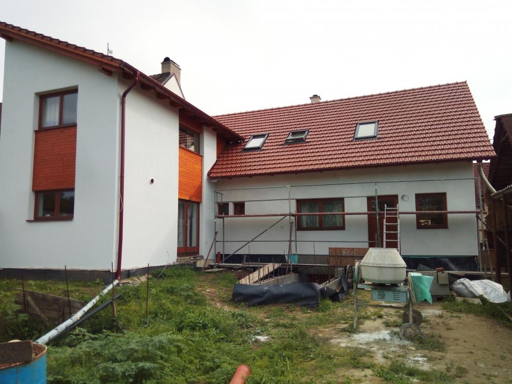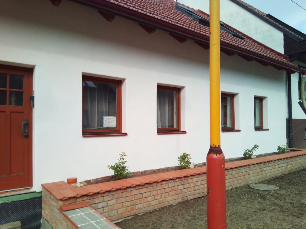 Nově postavený slaměný dům ve staré řadové zástavbě. Jako podklad bylo použito dřevěné diagonální laťování, na které se připevnil štukatérský rákos. Do první vrstvy hrubé omítky se zapracovala perlinka a druhá vrstva se zatočila hladítkem s houbou. Zakulacení špalet a provedení řízené spáry u dřevěných prvků je samozřejmostí...
