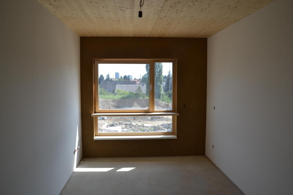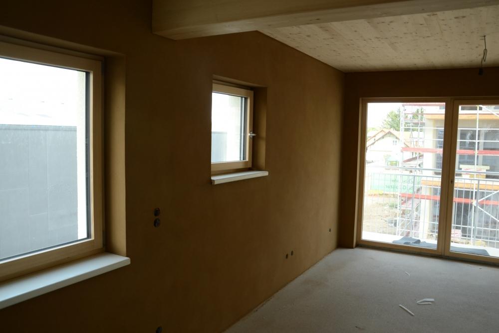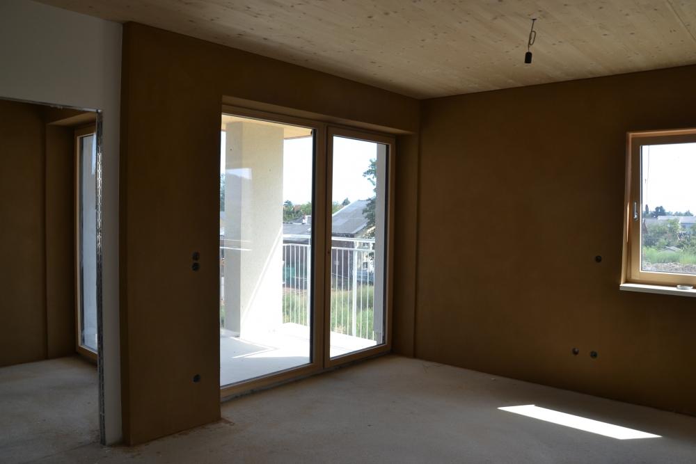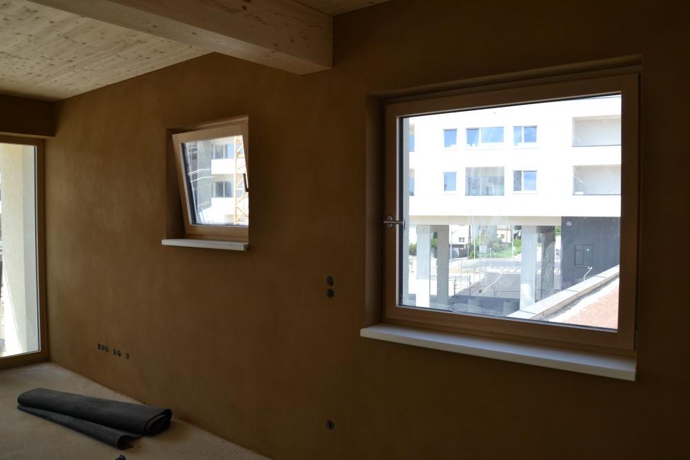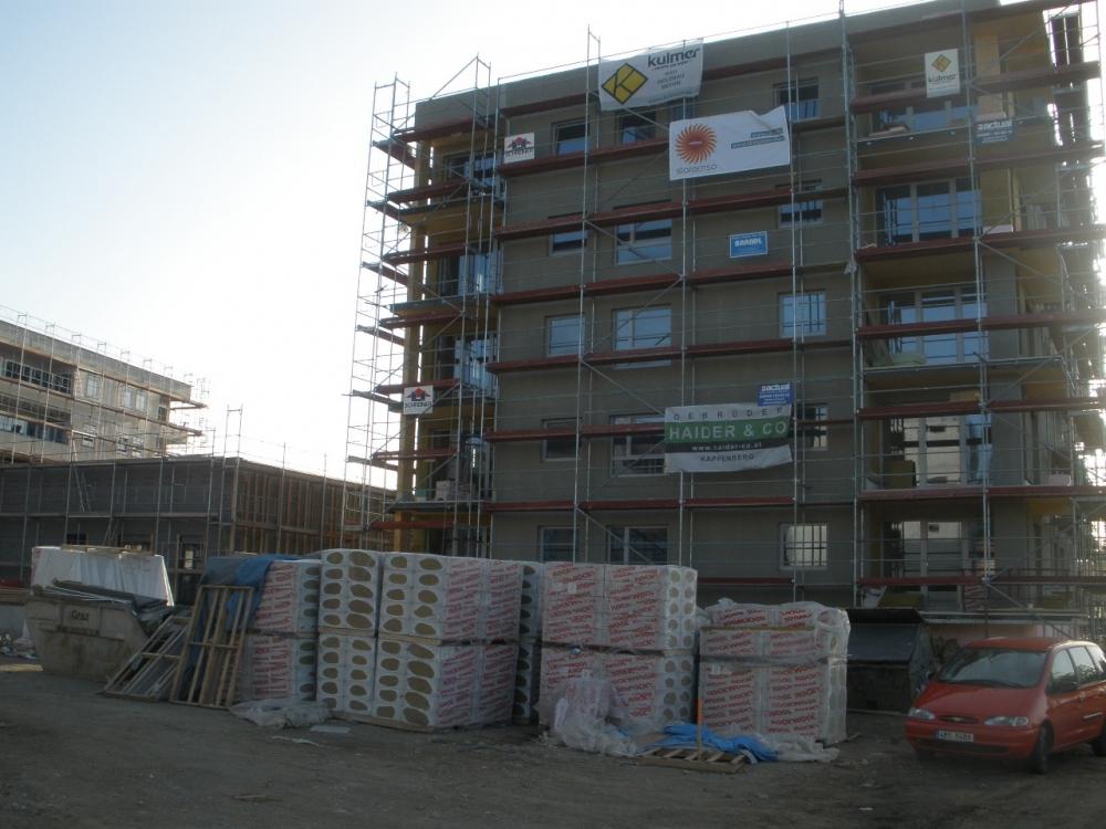 V Grazu vyrůstá sídlište asi 15 bytových domů (3-5 pater), které omítáme hlínou. Každý bytový dům je tvořen ze zělezobetonového jádra (schodiště a výtahová šachta), nosné zdi jsou stavěny z lepených vrstvených dřevěných desek (něco podobného u nás dělá fy. Novatop), které jsou horší kvality-nepohledové. Tyto se na vnitřních příčkách oplášťují z každé strany dvěma vrstvami SDK a na obvodové stěny se ze strany interiéru nastřelují hliněné panely od Procrea, které se omítají hliněnou omítkou do omítníků v tloušťce 10mm hrubá omítka opatřená perlinkou a 3mm jemná omítka filcovaná. Zbývající nenosné vnitřní příčky se staví klasicky z SDK. Jediné krásné pohledové dřevo je na stropě a musíme si sakra dávat pozor na jeho neušpinění při omítání.