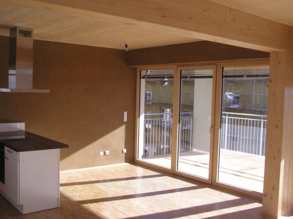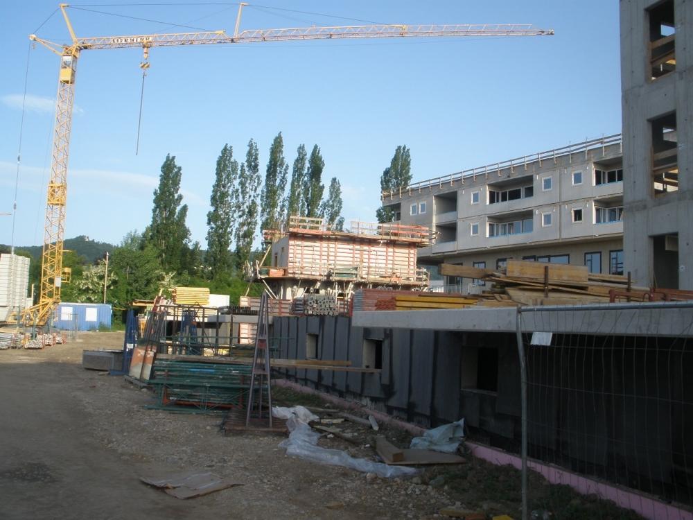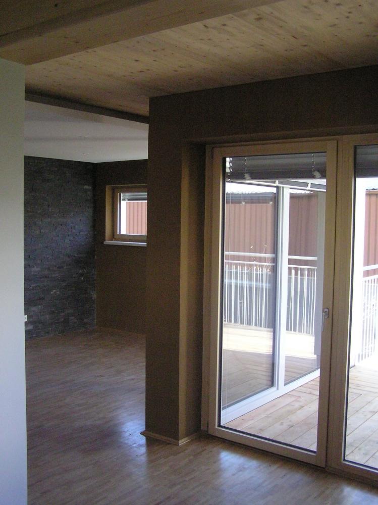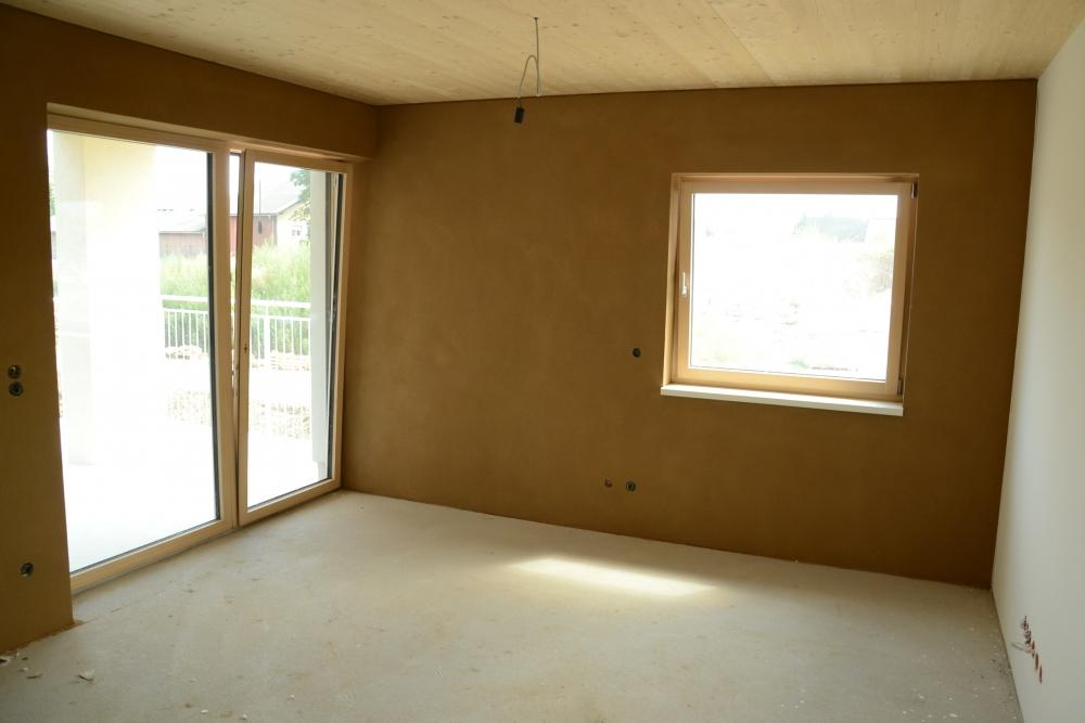 V Grazu vyrůstá sídlište asi 15 bytových domů (3-5 pater), které omítáme hlínou. Každý bytový dům je tvořen ze zělezobetonového jádra (schodiště a výtahová šachta), nosné zdi jsou stavěny z lepených vrstvených dřevěných desek (něco podobného u nás dělá fy. Novatop), které jsou horší kvality-nepohledové. Tyto se na vnitřních příčkách oplášťují z každé strany dvěma vrstvami SDK a na obvodové stěny se ze strany interiéru nastřelují hliněné panely od Procrea, které se omítají hliněnou omítkou do omítníků v tloušťce 10mm hrubá omítka opatřená perlinkou a 3mm jemná omítka filcovaná. Zbývající nenosné vnitřní příčky se staví klasicky z SDK. Jediné krásné pohledové dřevo je na stropě a musíme si sakra dávat pozor na jeho neušpinění při omítání.