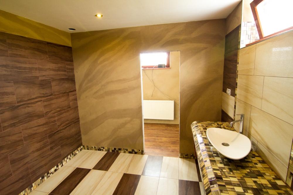 Hliněná omítka dvou barev v kombinaci s imitací australského pískovce se v konečném důsledku ukázala jako velmi dobrá volba, která umocnila celkový dojem koupelny. Použitý materiál - Picas econom jemná, dobarvená pigmenty od základní barvy do světlé a tmavé. Zpracováno v tl. 12 - 18 mm.